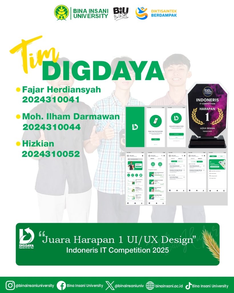 Selamat & sukses kepada Tim mahasiswa Bina Insani University atas prestasi yang diraih sebagai Juara Harapan I Kategori UI/UX Design dalam Indoneris IT Competition Tahun 2025.