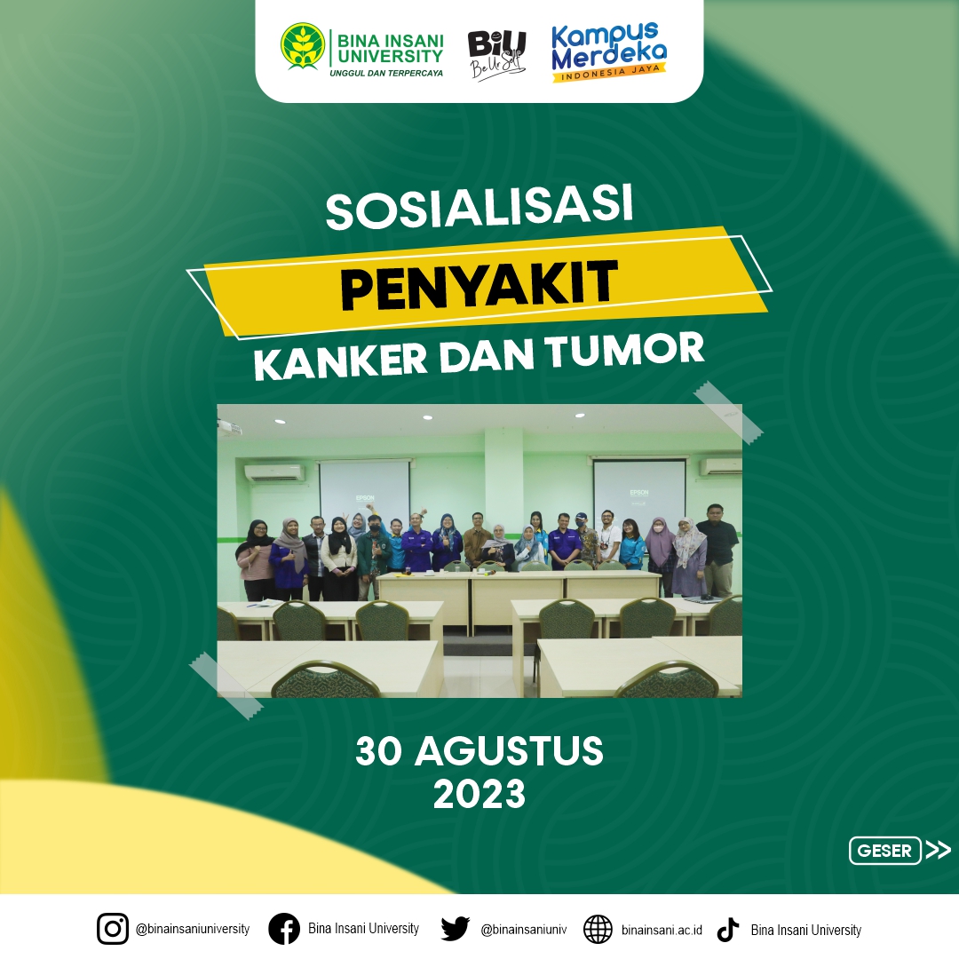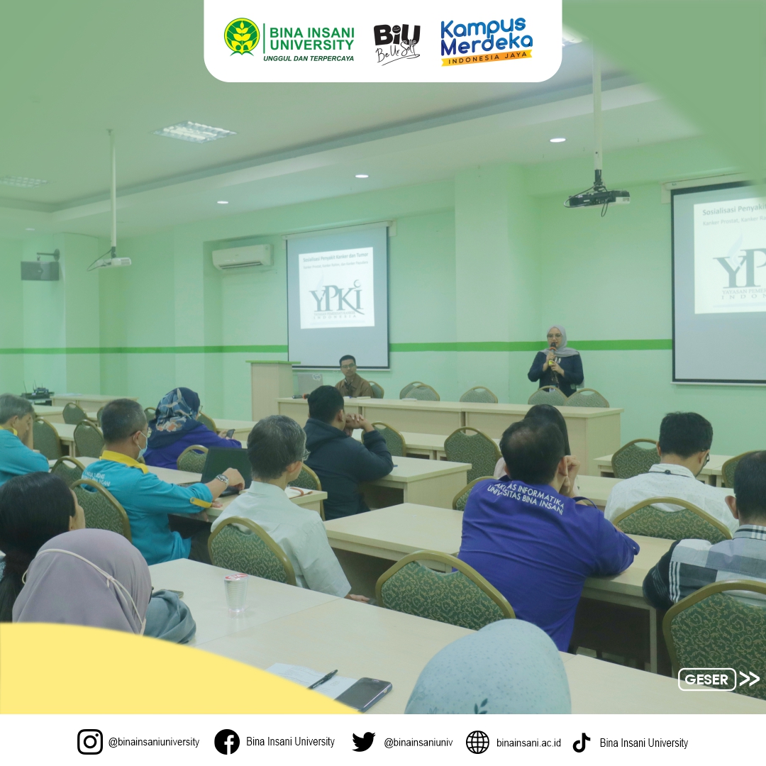 Segenap Civitas Akademika Universitas Bina Insani telah menghadiri kegiatan Penyuluhan & Sosialisasi penyakit Kanker & Tumor pada hari ini. Kegiatan ini dilakukan di ruang seminar lt.2 Universitas Bina Insani dan dipandu langsung oleh Ibu Afina Putri Indriani, A.Md., Keb. dari Yayasan Pemerhati Kanker Indonesia (YPKI). Dengan diadakannya kegiatan ini Diharapkan masyarakat, terutama peserta yang menghadiri kegiatan penyuluhan dan sosialisasi penyakit kanker dan tumor di Universitas Bina Insani, dapat mendapatkan pemahaman yang lebih baik tentang penyakit kanker dan tumor, termasuk faktor risiko, gejala awal, metode deteksi dini, serta berbagai opsi pengobatan yang tersedia. Kegiatan ini juga diharapkan dapat membantu mengurangi stigma dan ketidakpastian yang sering terkait dengan penyakit ini.