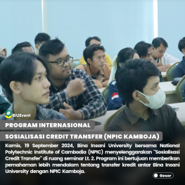 Bina Insani University View mapBekasi, 19 September 2024 – Universitas Bina Insani bersama National Polytechnic Institute of Cambodia (NPIC) telah menyelenggarakan kegiatan Sosialisasi Credit Transfer. Program ini bertujuan untuk memberikan pemahaman yang lebih mendalam tentang mekanisme transfer kredit antara Universitas Bina Insani dan NPIC Kamboja.