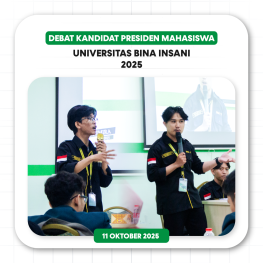 Jl. Siliwangi No. 6 Sepanjang Jaya, Kec. Rawa Lumbu, Kota Bekasi 17114 View mapBekasi, 11 Oktober 2025 – Telah diselenggarakan Debat Kandidat Presiden Mahasiswa Universitas Bina Insani untuk Periode 2025–2026 bertempat di Ruang Seminar Universitas Bina Insani. Kegiatan ini juga disiarkan secara live melalui kanal YouTube resmi Bina Insani University, sehingga dapat diikuti oleh seluruh mahasiswa secara daring.