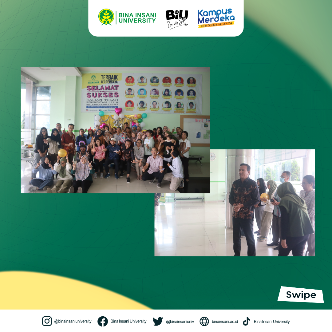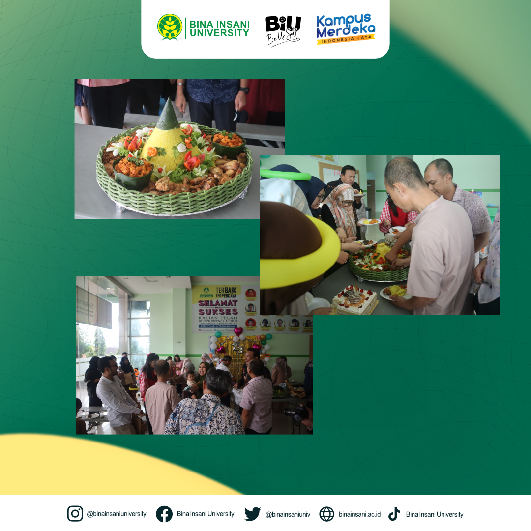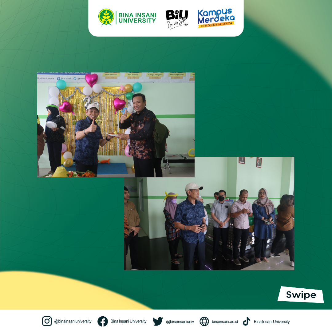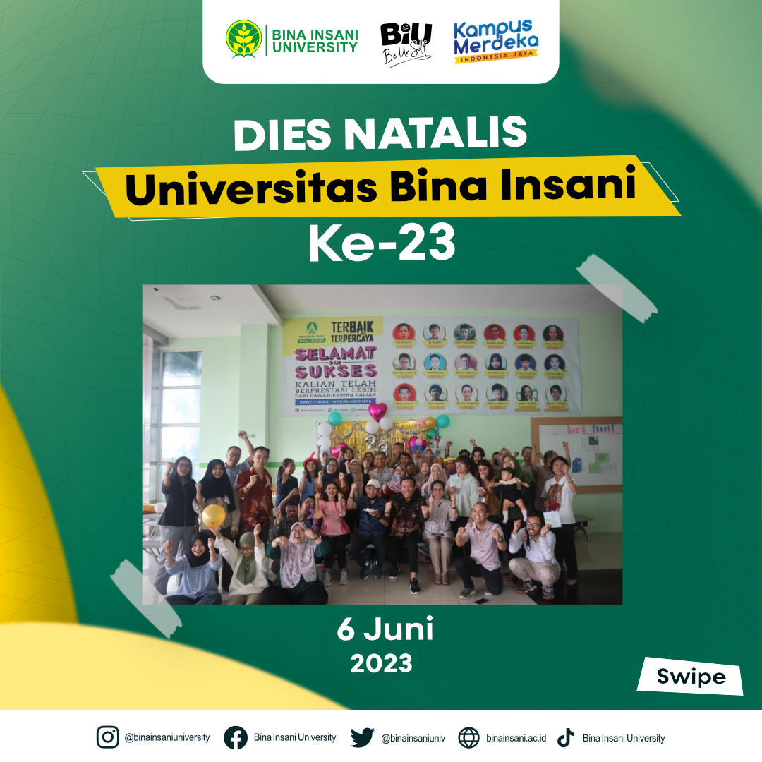 Universitas Bina Insani telah merayakan hari lahir atau Dies Natalisnya yang ke-23 pada Selasa, 06 Juni 2023 ini. Perayaan sekaligus syukuran ini dilakukan di Lt.1 Lobi Universitas Bina Insani bersama dengan segenap Civitas Akademika Kampus. Acara ini diawali dengan sambutan dari Rektor Universitas Bina Insani yaitu Bapak Dr. Indra Muis, S.S.,M.M, kemudian acara tiup lilin dan juga pemotongan nasi tumpeng yang diwakili oleh Ketua Yayasan Universitas Bina Insani yaitu Bapak Ir. Luthvi Rachman Er. M.M., lalu ditutup dengan kegiatan do’a bersama dan beberapa acara kecil lainnya.