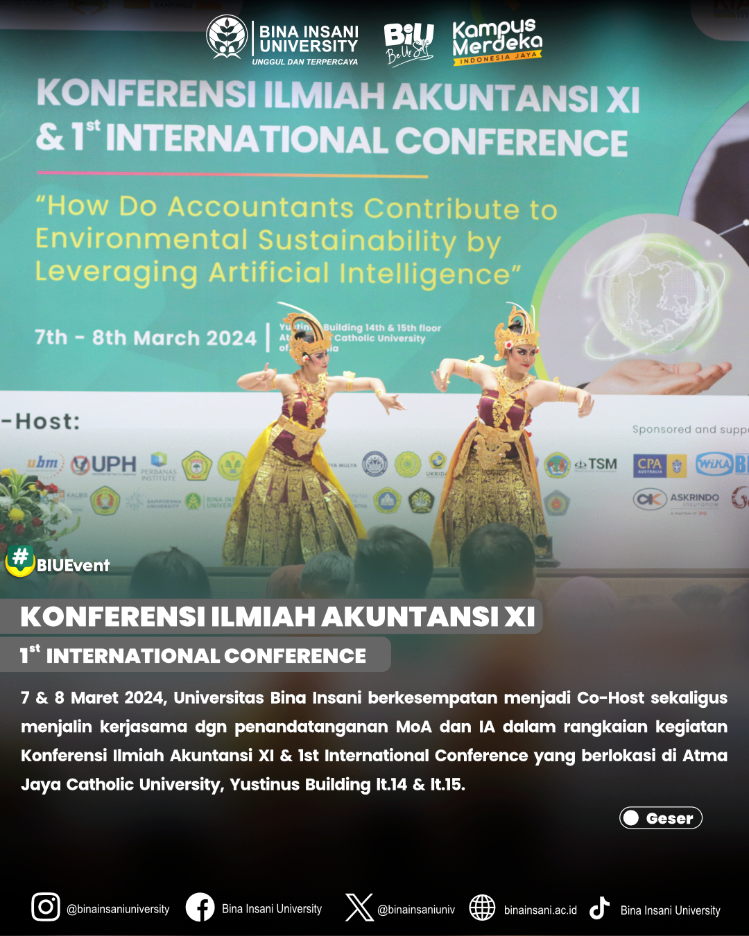 Universitas Bina Insani berkesempatan menjadi Co-Host sekaligus menjalin kerjasama dengan penandatanganan MoA dan IA dalam rangkaian kegiatan Konferensi Ilmiah Akuntansi XI & 1st International Conference yang berlokasi di Atma Jaya Catholic University pada tanggal 7 & 8 Maret 2024. 🙌✨️