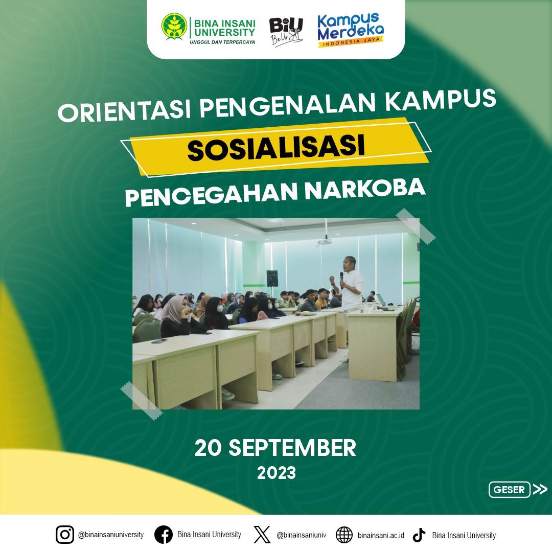 Universitas Bina Insani tengah menggelar kegiatan seminar “Cegah dan Lawan Penyalahgunaan Narkoba” yang diselenggarakan untuk Mahasiswa Baru Tahun Akademik 2023/2024. Acara berlangsung pada hari Rabu, 20 September 2023, di Ruang Seminar Lt.2 Universitas Bina Insani. Kegiatan ini merupakan bagian penting dari bagian Orientasi Pengenalan Kampus (OPK) untuk Mahasiswa Baru Universitas Bina Insani.