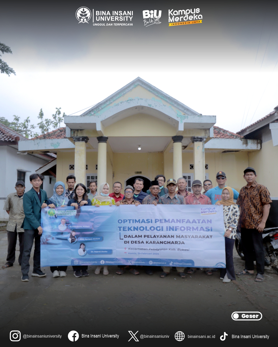 Beberapa dosen dari Universitas Bina Insani telah melakukan kegiatan Pengabdian Kepada Masyarakat (PKM) di Desa Karangharja, Pebayuran, Kabupaten Bekasi pada hari Kamis, 29 Februari 2024.
