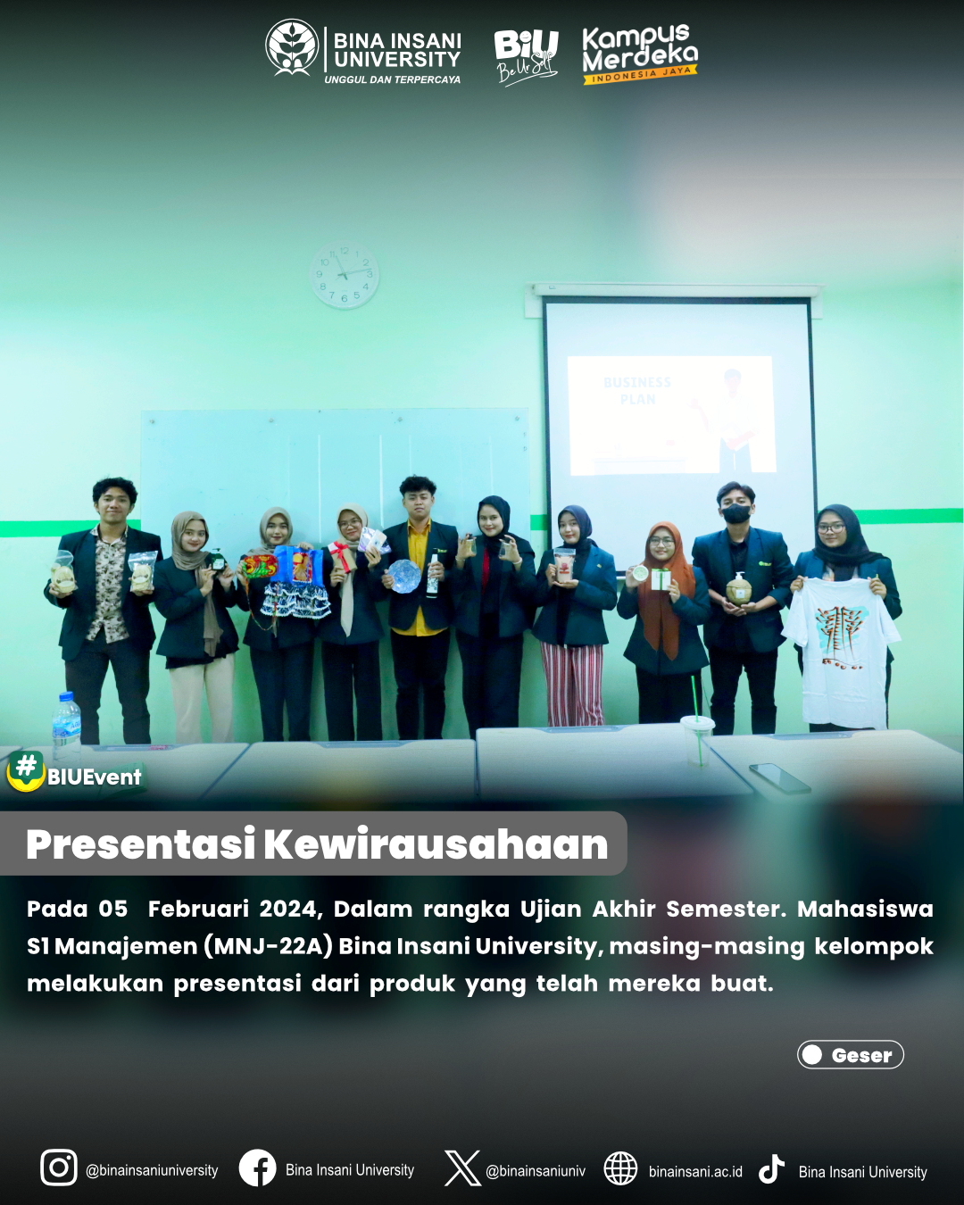 Dalam rangka menjalankan Ujian Akhir Semester (UAS), mahasiswa @fakultasbisnis_biu Program Studi S1 Manajemen kelas MNJ22A Universitas Bina Insani melakuka pada Senin, 5 Februari 2024. Masing-masing kelompok melakukan presentasi dari produk yang telah mereka buat.