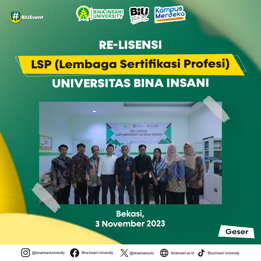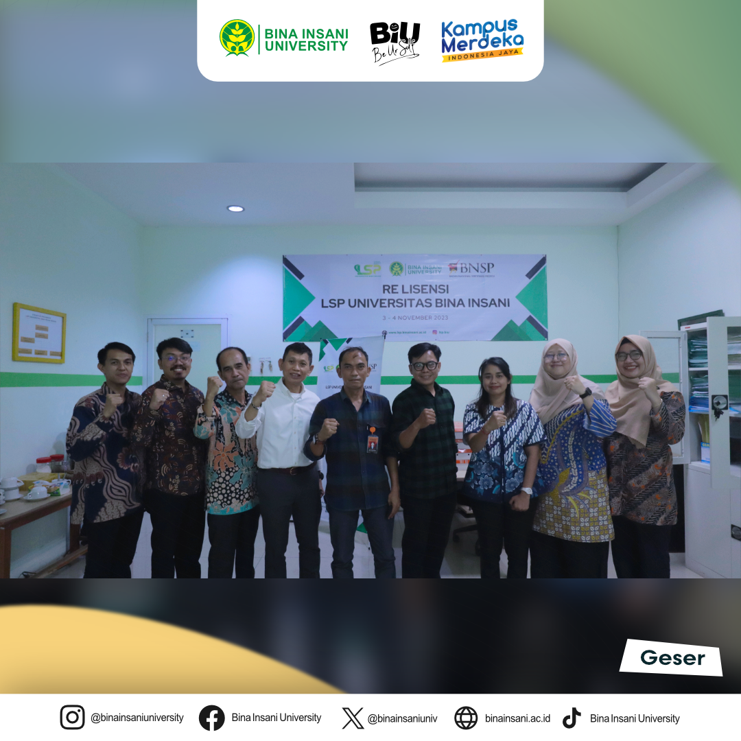Lembaga Sertifikasi Profesi (LSP) Universitas Bina Insani telah melakukan relisensi bersama Tim dari Badan Nasional Sertifikasi Profesi (BNSP) pada Jumat, 3 November 2023 di Ruang LSP Universitas Bina Insani.