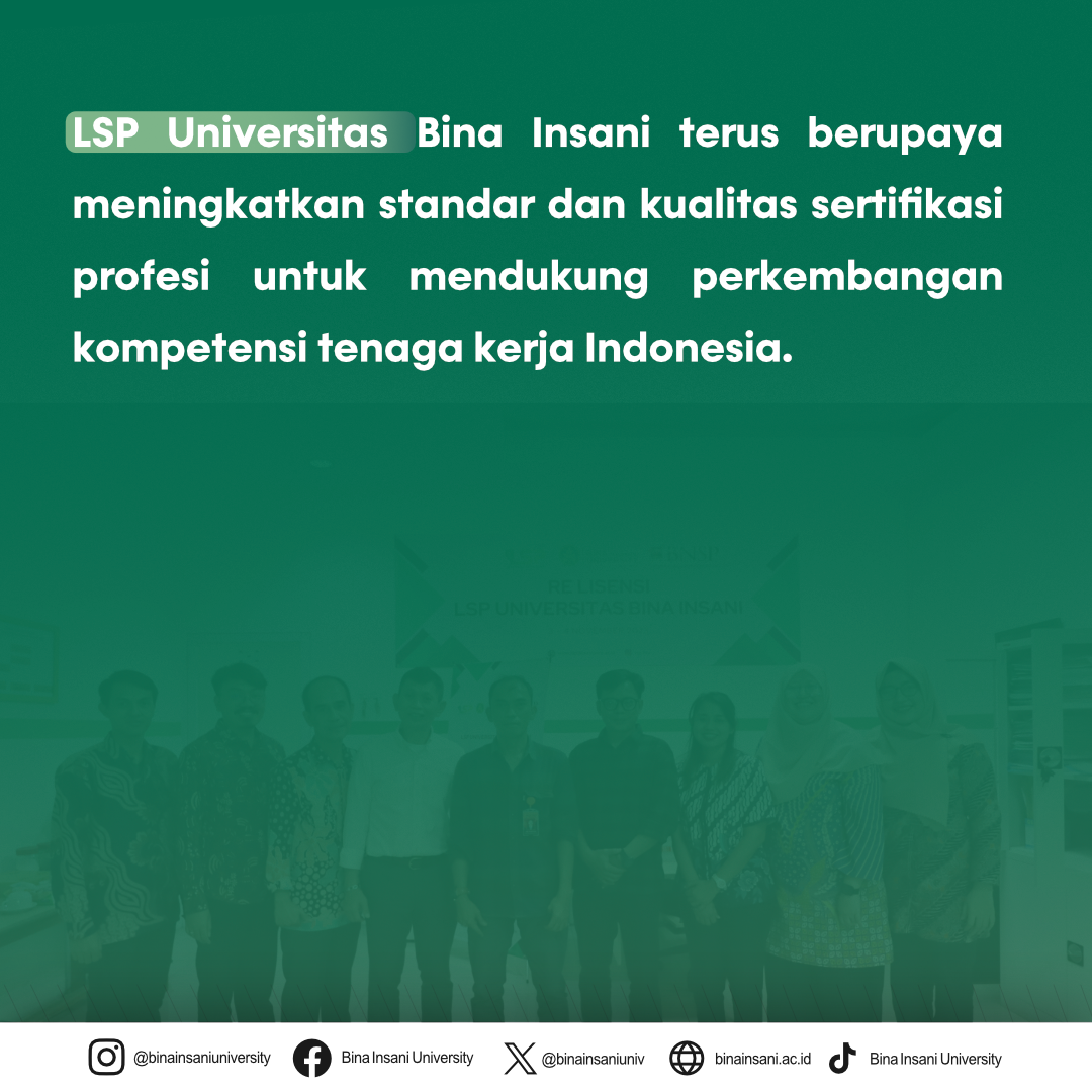 Dengan terlaksananya relisensi ini, semoga LSP Universitas Bina Insani dapat terus berupaya untuk meningkatkan standar dan kualitas sertifikasi profesi juga memberikan kontribusi positif bagi peningkatan kompetensi tenaga kerja di Indonesia. 🙌🏻