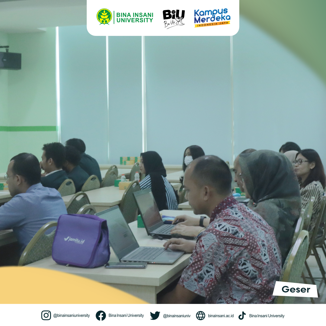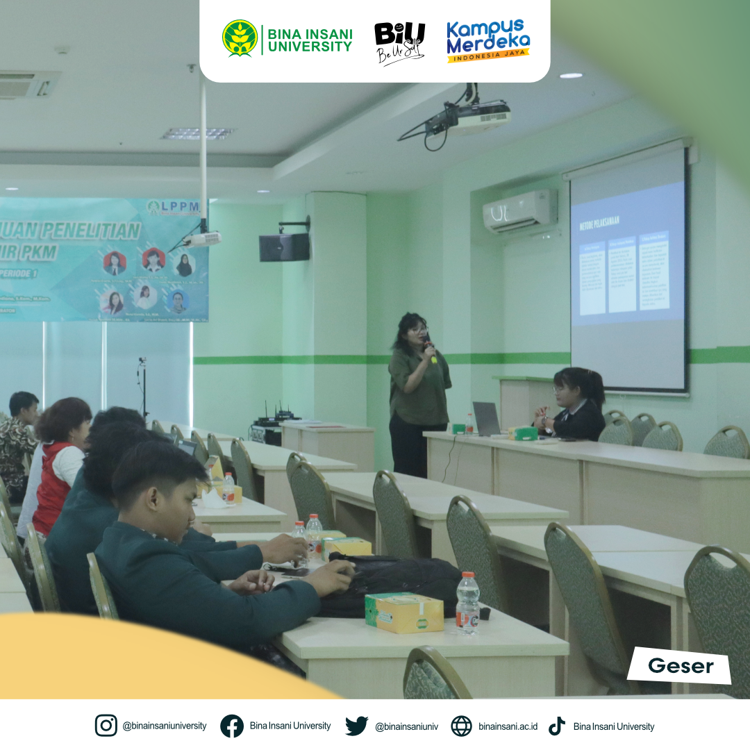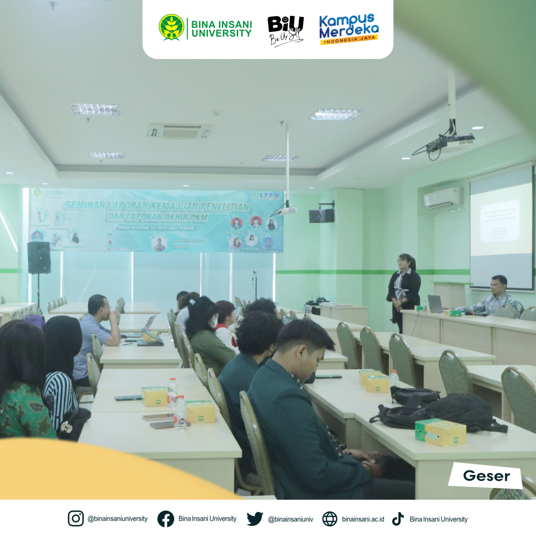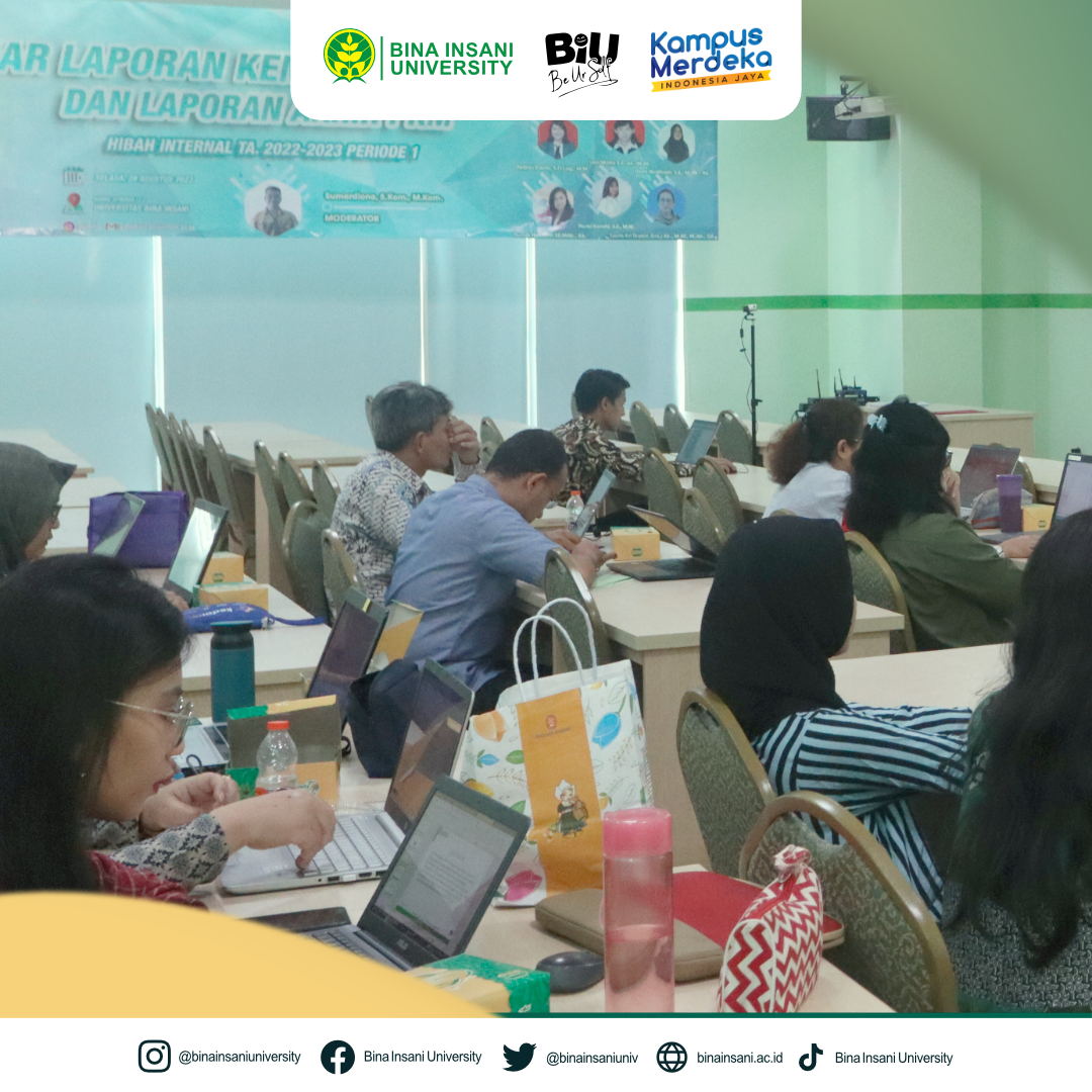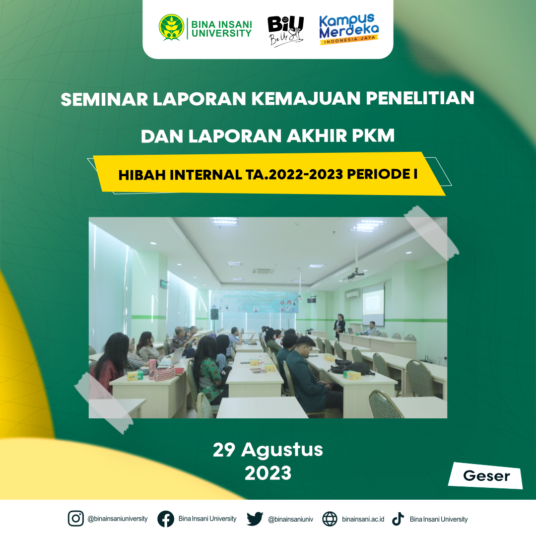 Universitas Bina Insani telah melakukan Kegiatan Seminar Laporan Kemajuan Penelitian dan Laporan Akhir PKM Hibah Internal TA. 2022-2023 Periode 1. Kegiatan ini dilaksanakan secara hybrid pada hari Selasa, 29 Agustus 2023 di ruang seminar Lt.2 Universitas Bina Insani dan dihadiri oleh bapak/ibu dosen yang telah lulus hibah internal untuk dapat mempersiapkan presentasi laporan kemajuan penelitian atau laporan akhir PKM. Kami berharap melalui seminar ini, wawasan baru akan muncul, kolaborasi ilmiah akan ditingkatkan, dan dampak nyata akan tercipta dalam masyarakat. Terima kasih atas partisipasi aktif Anda dalam memajukan dunia penelitian dan pengabdian masyarakat!