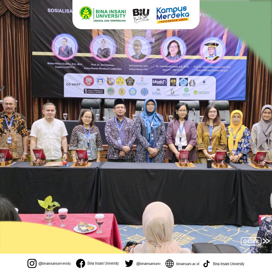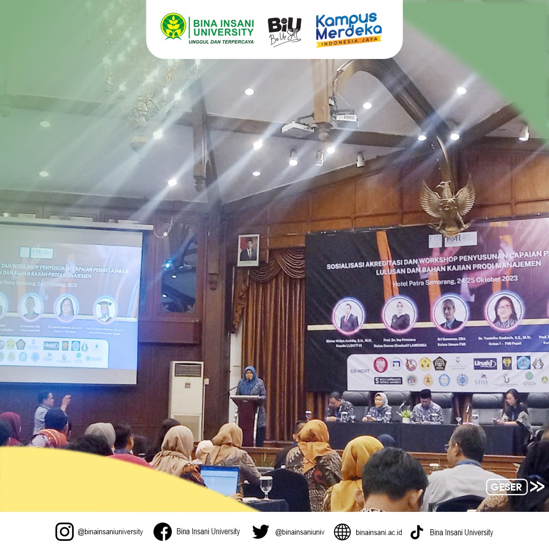 MinBi mau share dokumentasi kegiatan dari Forum Manajemen Indonesia (FMI) yaitu Sosialisasi Akreditasi dan Workshop Penyusunan Capaian Pembelajaran Lulusan dan Bahan Kajian Program Studi Manajemen yang diadakan di Hotel Patra, Semarang nih! Kegiatan ini akan berlangsung selama dua hari, yaitu pada tanggal 24 hingga 25 Oktober 2023 dan Universitas Bina Insani turut andil menjadi co-host dalam kegiatan ini.