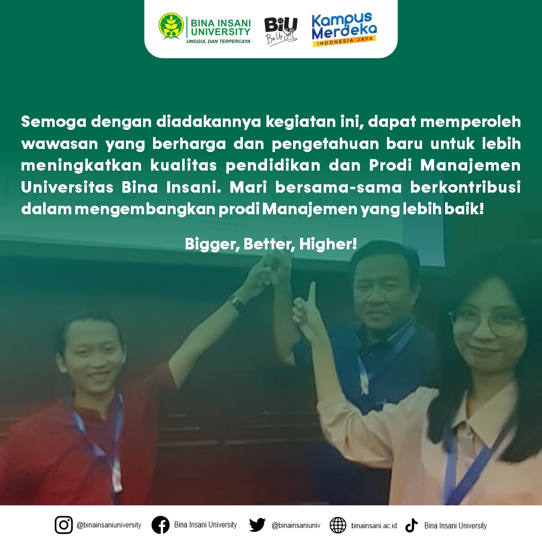 Semoga dengan diadakannya kegiatan ini, dapat memperoleh wawasan yang berharga dan pengetahuan baru untuk lebih meningkatkan kualitas pendidikan dan Prodi Manajemen Universitas Bina Insani. Mari bersama-sama berkontribusi dalam mengembangkan prodi Manajemen yang lebih baik! 📚🎓