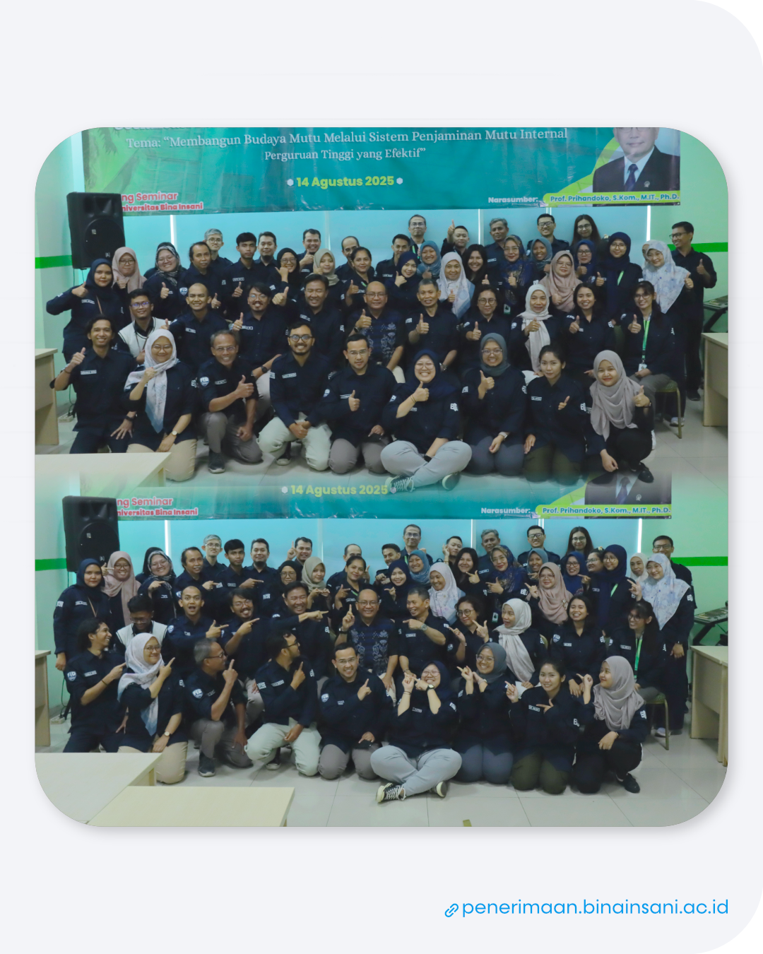 Dengan mengusung tema “Membangun Budaya Mutu Melalui Sistem Penjaminan Mutu Internal Perguruan Tinggi yang Efektif”, kegiatan ini diikuti oleh seluruh dosen dan tenaga kependidikan Bina Insani University.