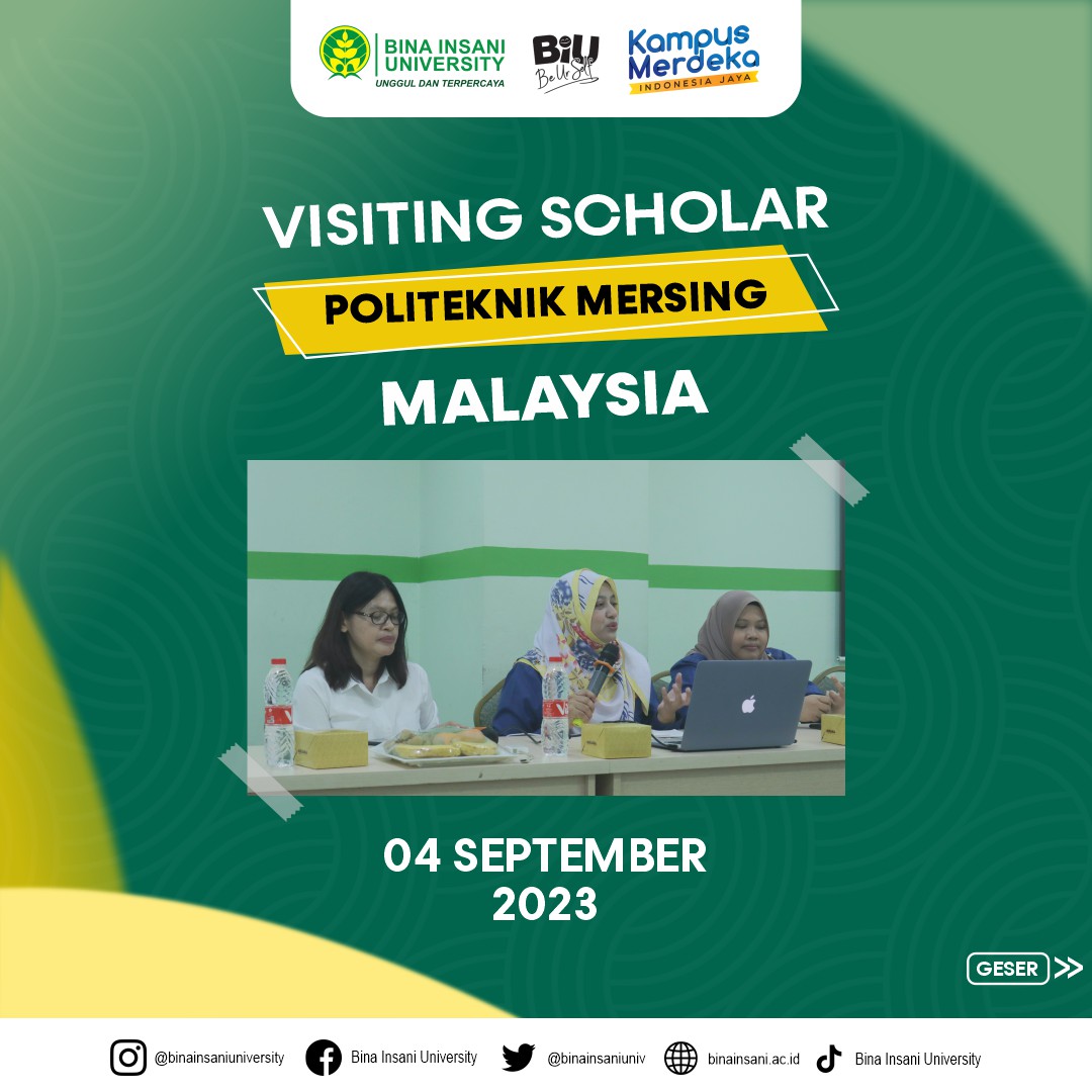 Bina Insani University telah sukses melaksanakan Program International Visiting Scholar yang diwakili oleh dua partisipan yaitu Ms. Raja Faraazlina Raja Mohamed Junior dan Ms. Norhaslinda Muhamadin, dari Politeknik Mersing Johor Baru Malaysia. Kegiatan ini berlangsung pada tanggal 4 September 2023 di kampus Bina Insani University pada pukul 09.00 WIB s/d 12.00 WIB.