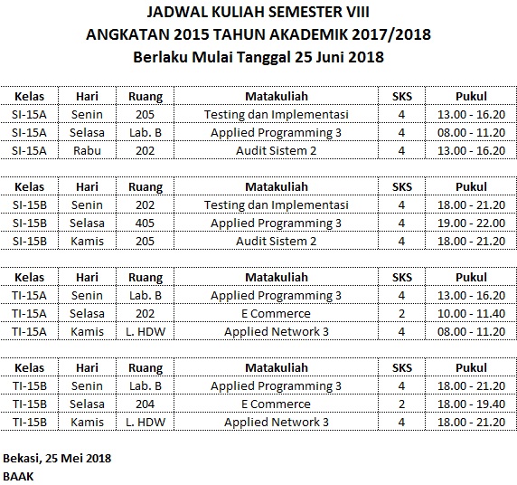 Jadwal Kuliah Semster VIII Angkatan 2015 TA 2017/2018 By binainsaniuniversity | 28/05/2018 | Akademik / Pendidikan | 0 Comments |