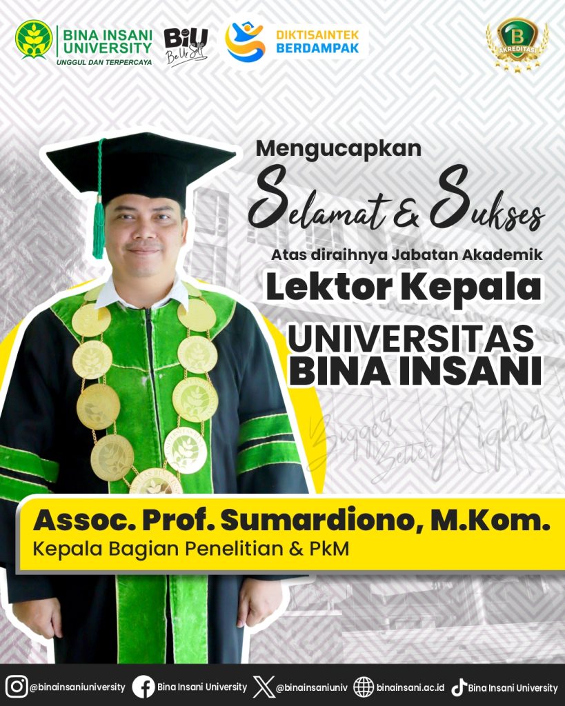 Segenap sivitas akademika Universitas Bina Insani mengucapkan Selamat dan Sukses atas diraihnya Jabatan Akademik Lektor Kepala oleh Bapak Assoc. Prof. Sumardiono, S.Kom., M.Kom. selaku Kepala Bagian Penelitian & PKM sekaligus Dosen di Universitas Bina Insani.